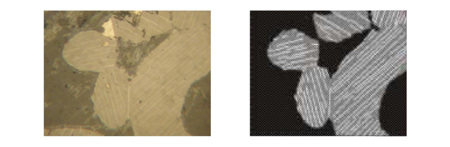 Ильменит + гематит. Образуют индивиды твердой смеси в соотношении три к одному. Соотношение установлено с помощью одной из прикладных компьютерных программ. С этой целью цифровое изображение полированной поверхности титановой руды месторождения Х было преобразовано в адаптационную трехцветную графическую модель – комбинацию черного, белого и серого цветов. Возможности прикладной программы позволили определить площади отдельных цветов. По принятой легенде черный цвет соответствовал нерудным минералам, серый – ильменитовым зернам, белый – гематитовым пластинам в индивидах ильменита. Незначительными включениями сульфидов в ильмените пренебрегли. После пропорциональных пересчетов было установлено, что в ильмените содержится 31,53 об. % гематита.